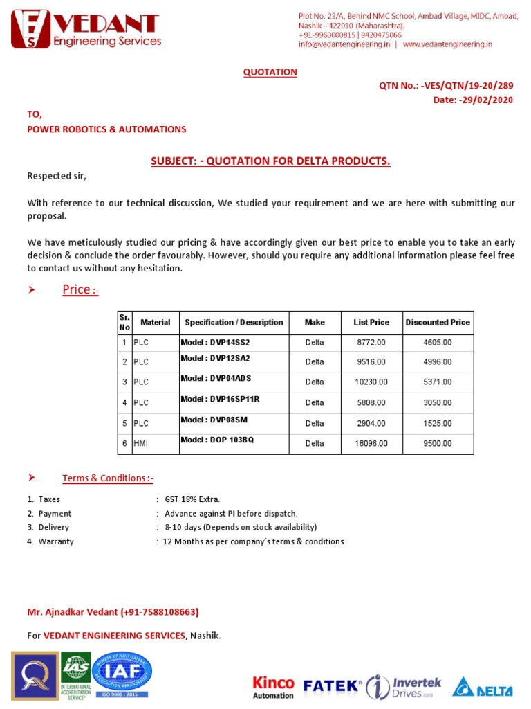 Price: Subject: - Quotation For Delta Products | PDF | Technology ...