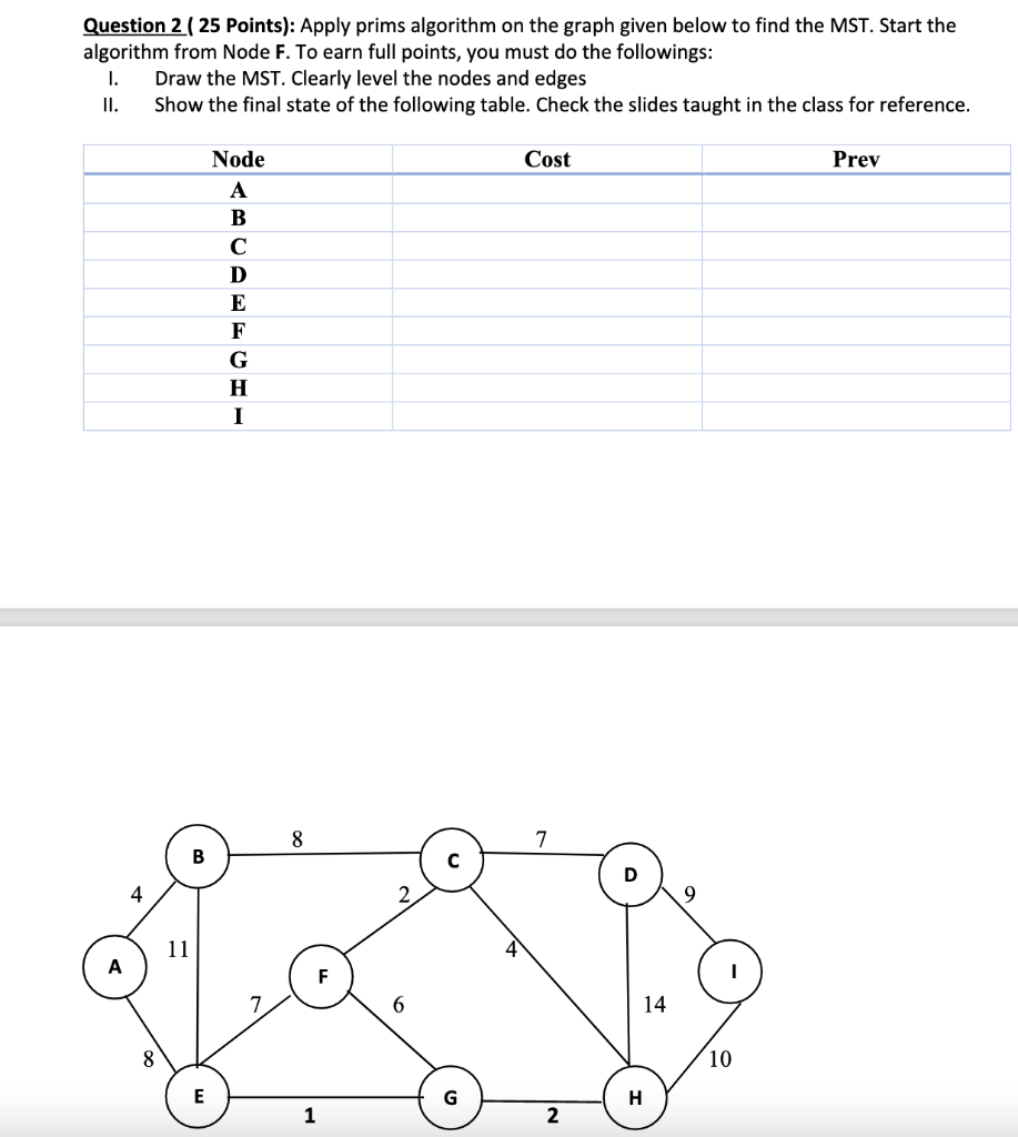Solved Question 2 ( 25 Points): Apply prims algorithm on the | Chegg.com
