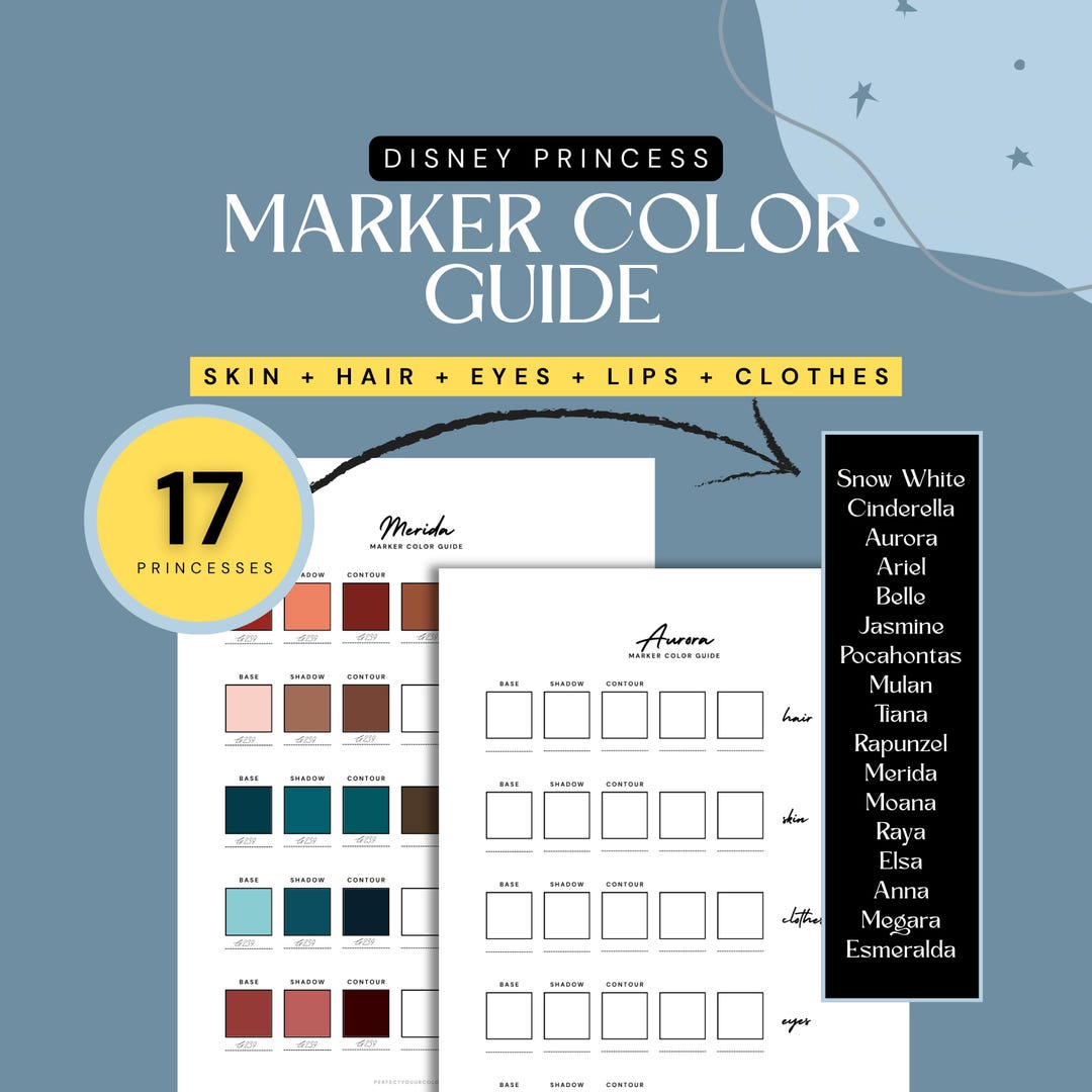 Disney Princess Marker Color Guide Bundle | 17 Character | Skin, Hair ...