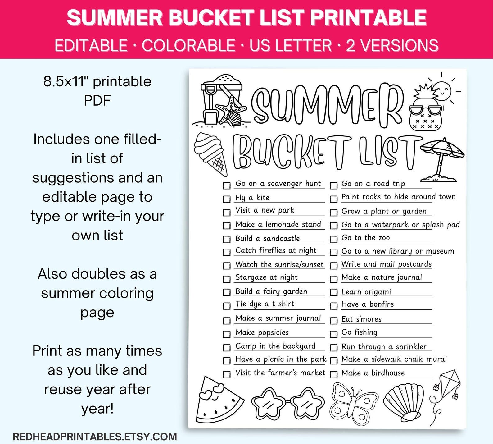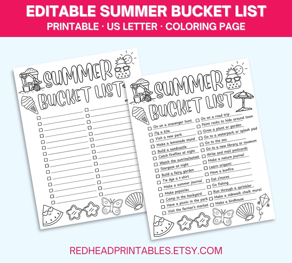 Summer Bucket List Printable Coloring Page, Editable Bucket List for ...