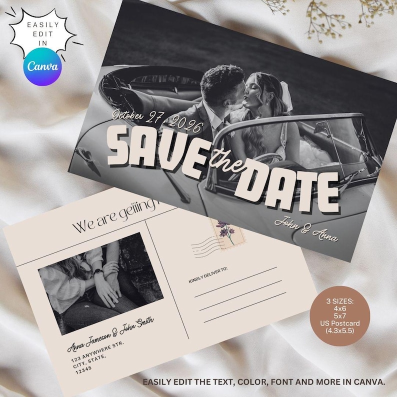 Vintage Postcard Save the Date Template | Editable Retro Wedding ...