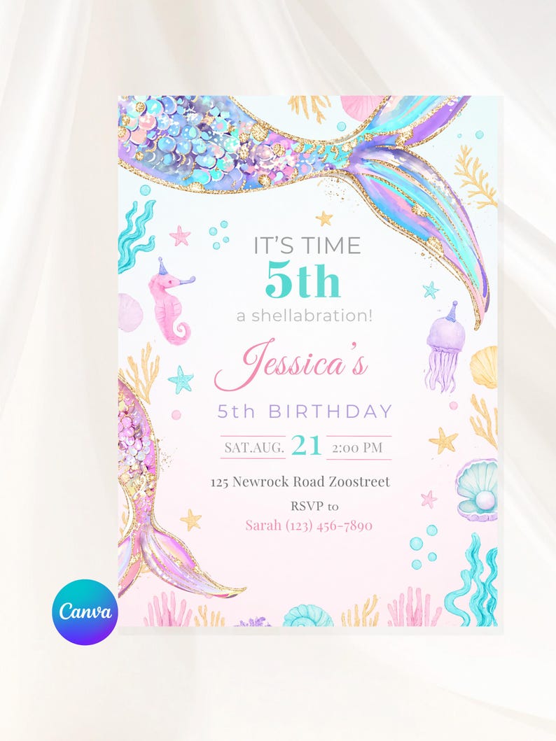 Mermaid Princess Fifth Birthday Invitation Template, Girl Mermaid ...