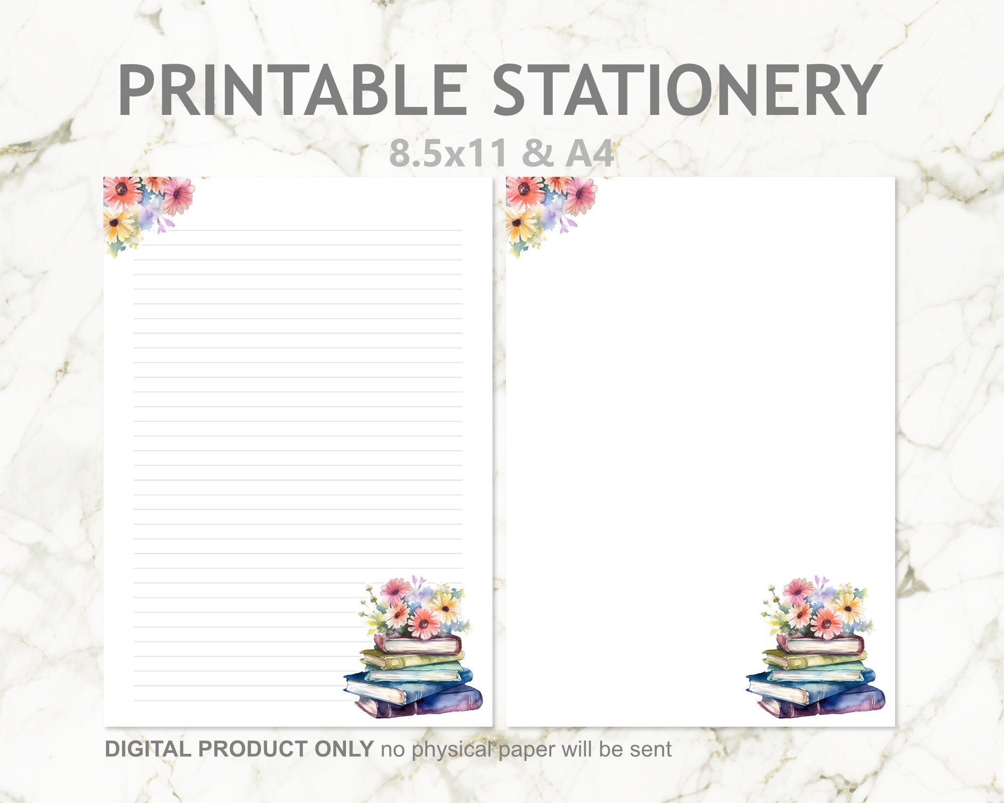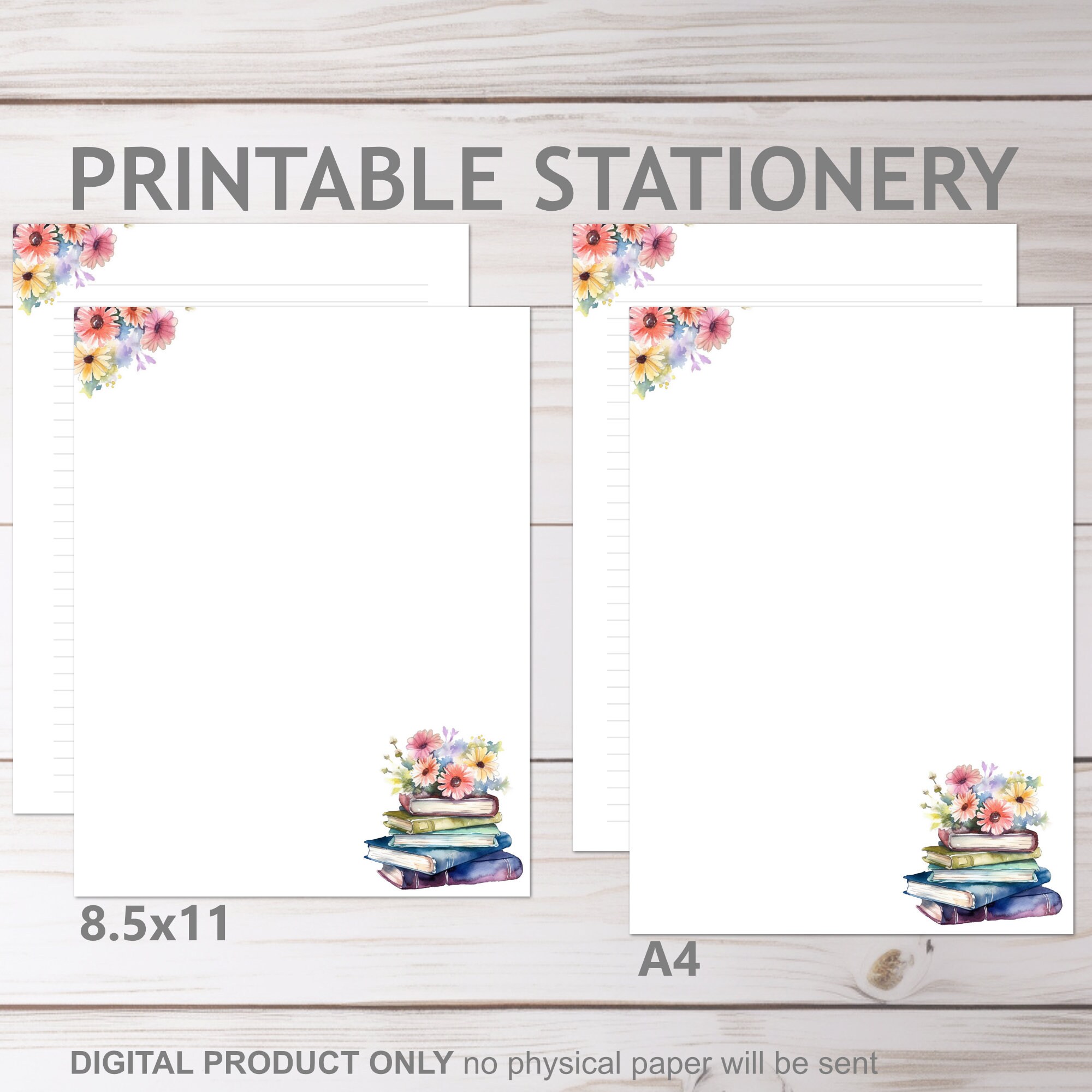 Stack of Books With Flowers Printable Stationery Set Lined and Unlined ...