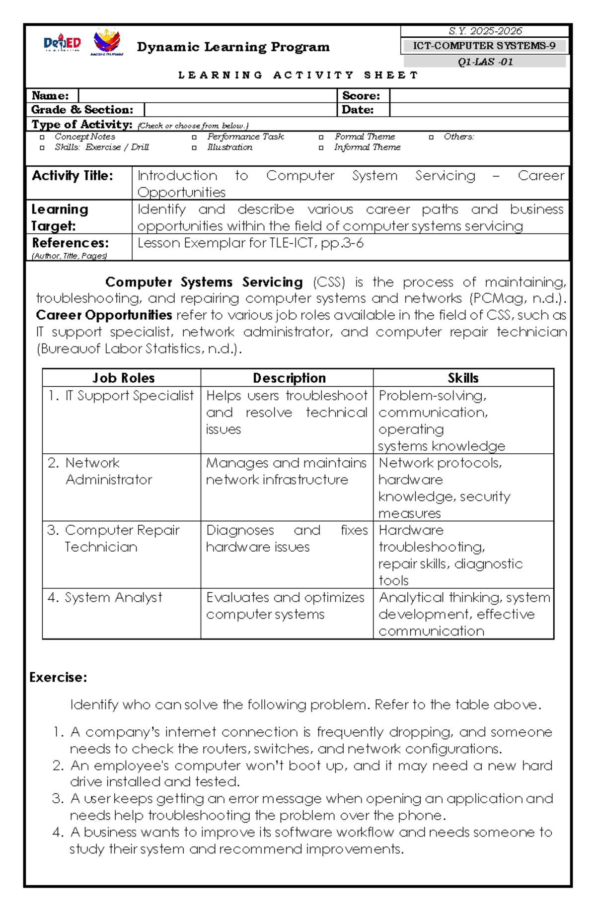 Q1-TLE9-ICT-LAS01: Career Paths in Computer System Servicing - Studocu