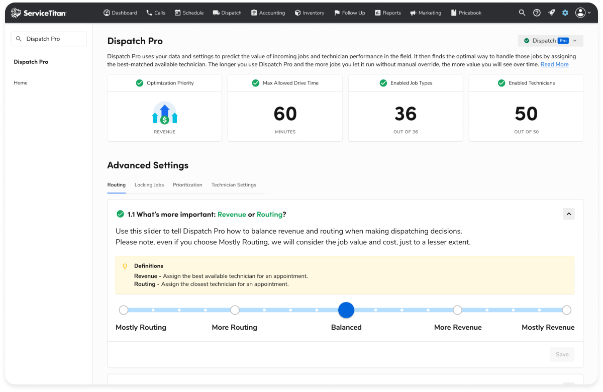 The ServiceTitan Dispatch Pro Settings screen. Tabs in the Settings ...