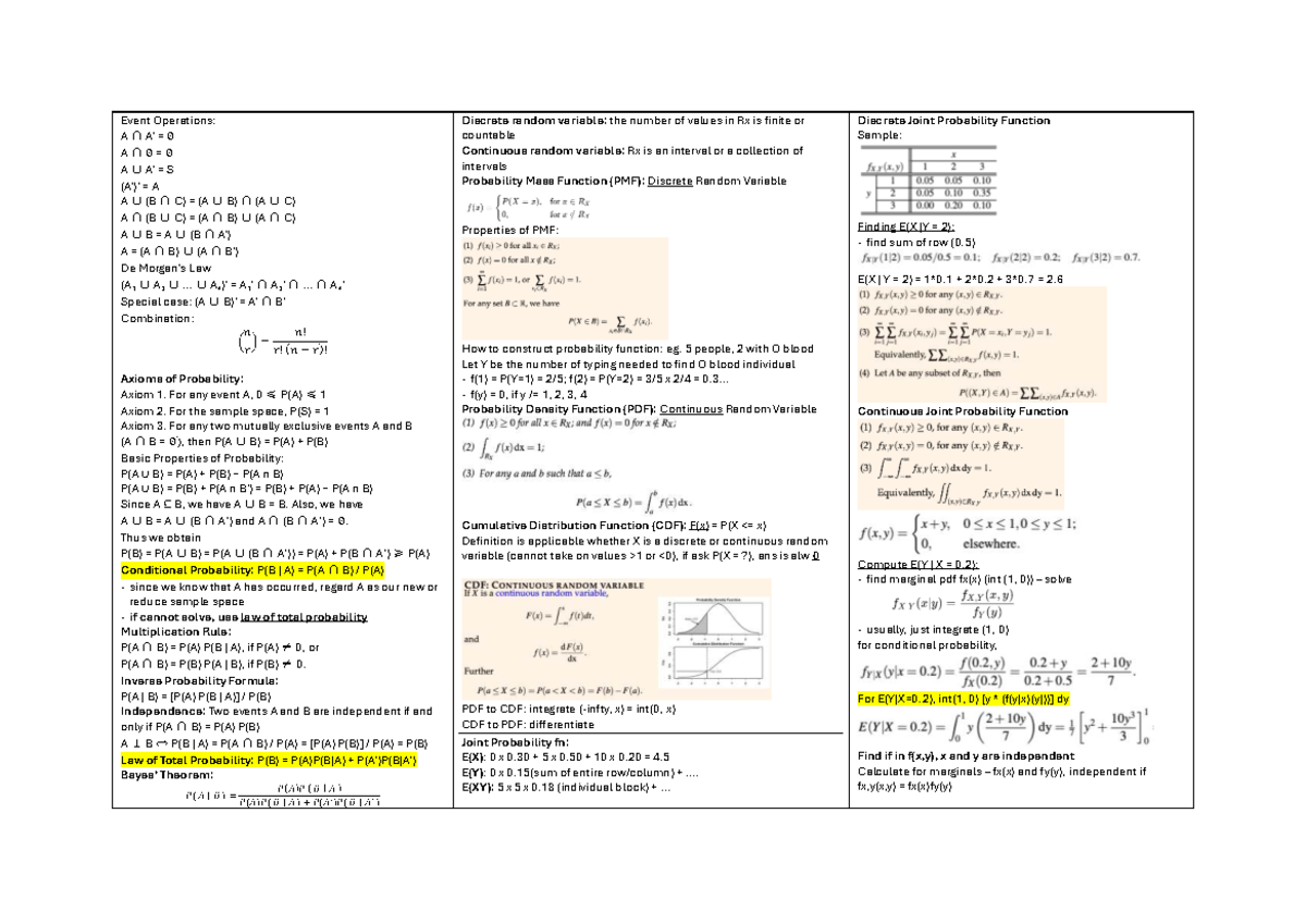 ST2334 Probability and Event Operations Cheatsheet - Studocu