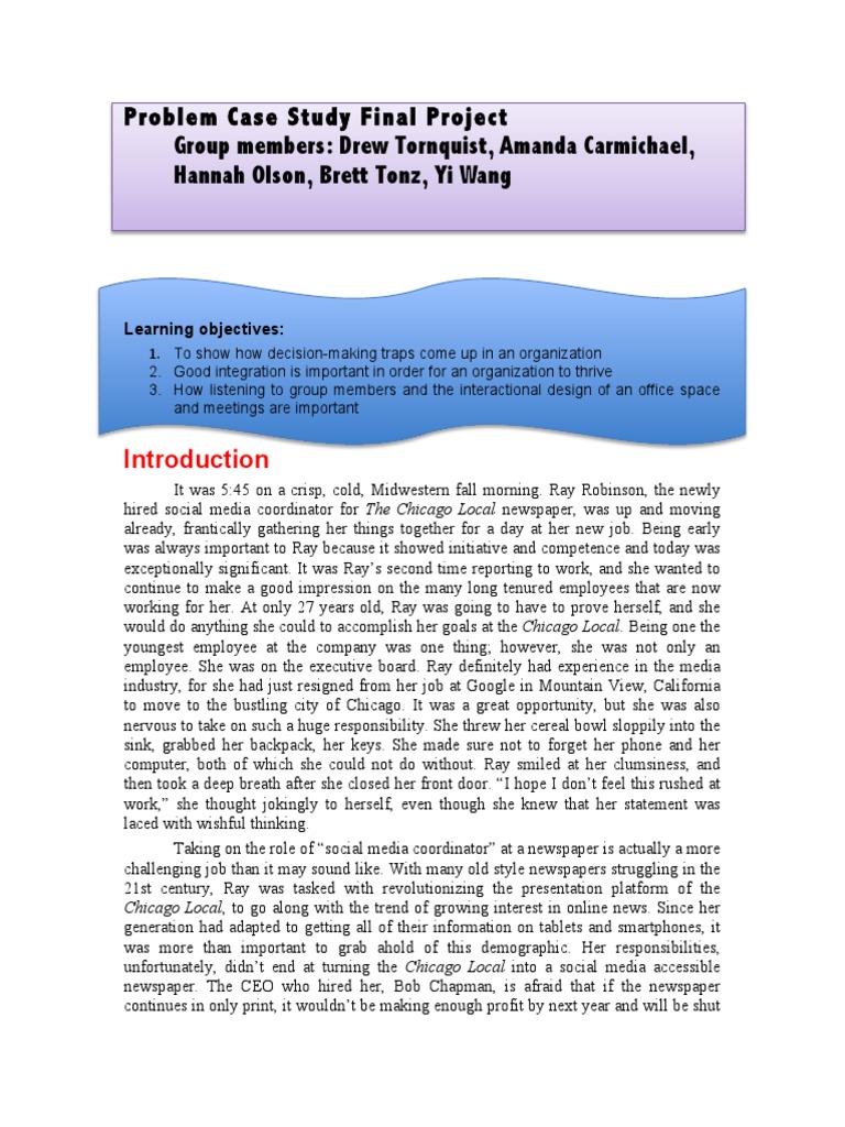 Problem Case Study Final Project Group Members: Drew Tornquist, Amanda ...