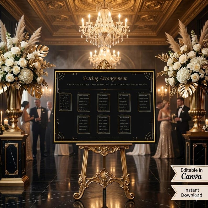 Art Deco Wedding Seating Chart | Black Gold Gatsby Template (24x18 ...