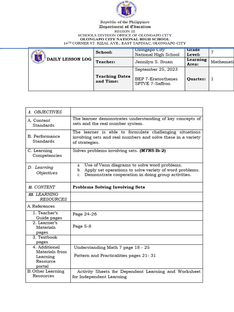 Math 7 - Q1 - WK 2 - Module 2 - Problems Involving Sets With The Use of ...