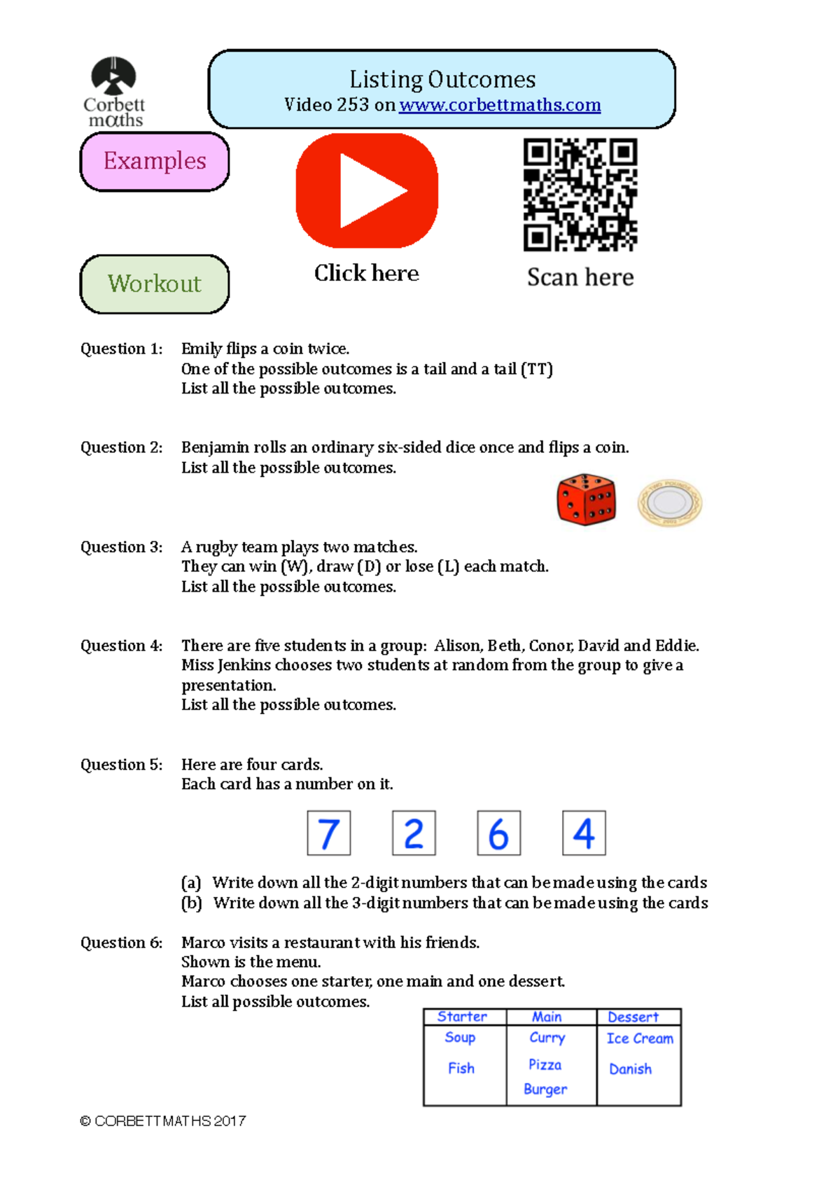 Listing Outcomes: Probability & Combinations - CORBETTMATHS 2017 - Studocu