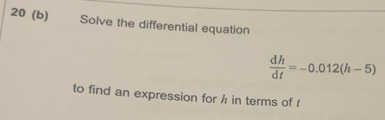 Solved: 20 (b) Solve the differential equation dh/dt =-0.012(h-5) to ...