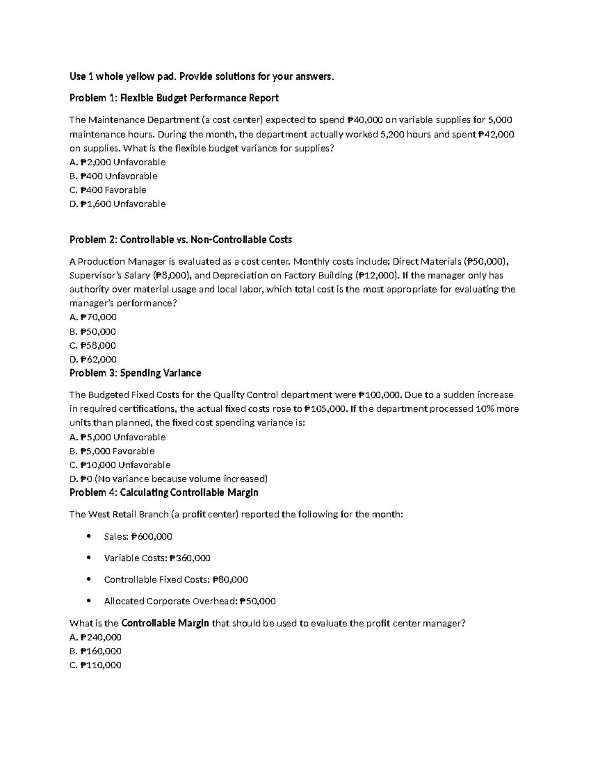 Responsibility Accounting MCQ Problems (ACCT 101) - Studocu