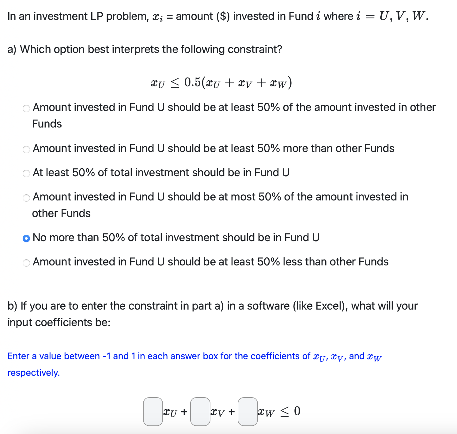 Solved In an investment LP problem, xi= amount (\$) invested | Chegg.com
