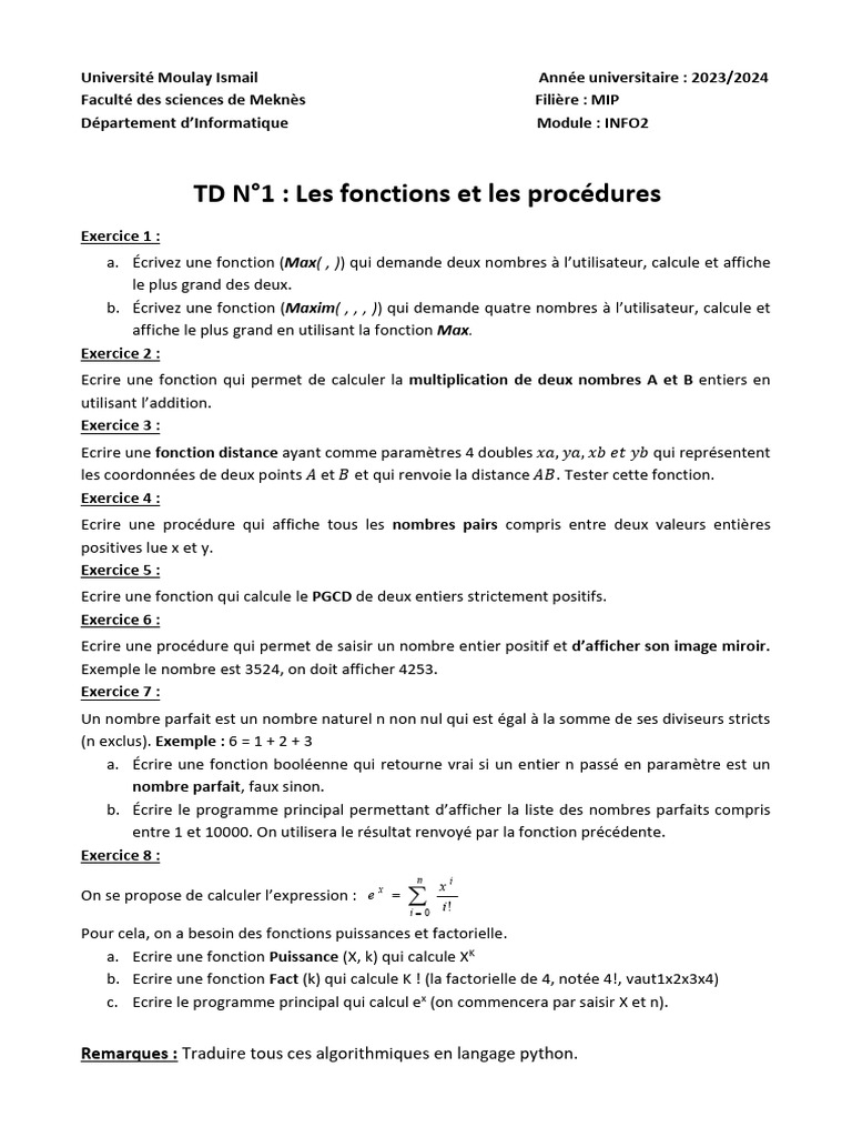 TD1 - Info2 - Algorithmique2-Python - Les Fonctions Et Les Procédures | PDF