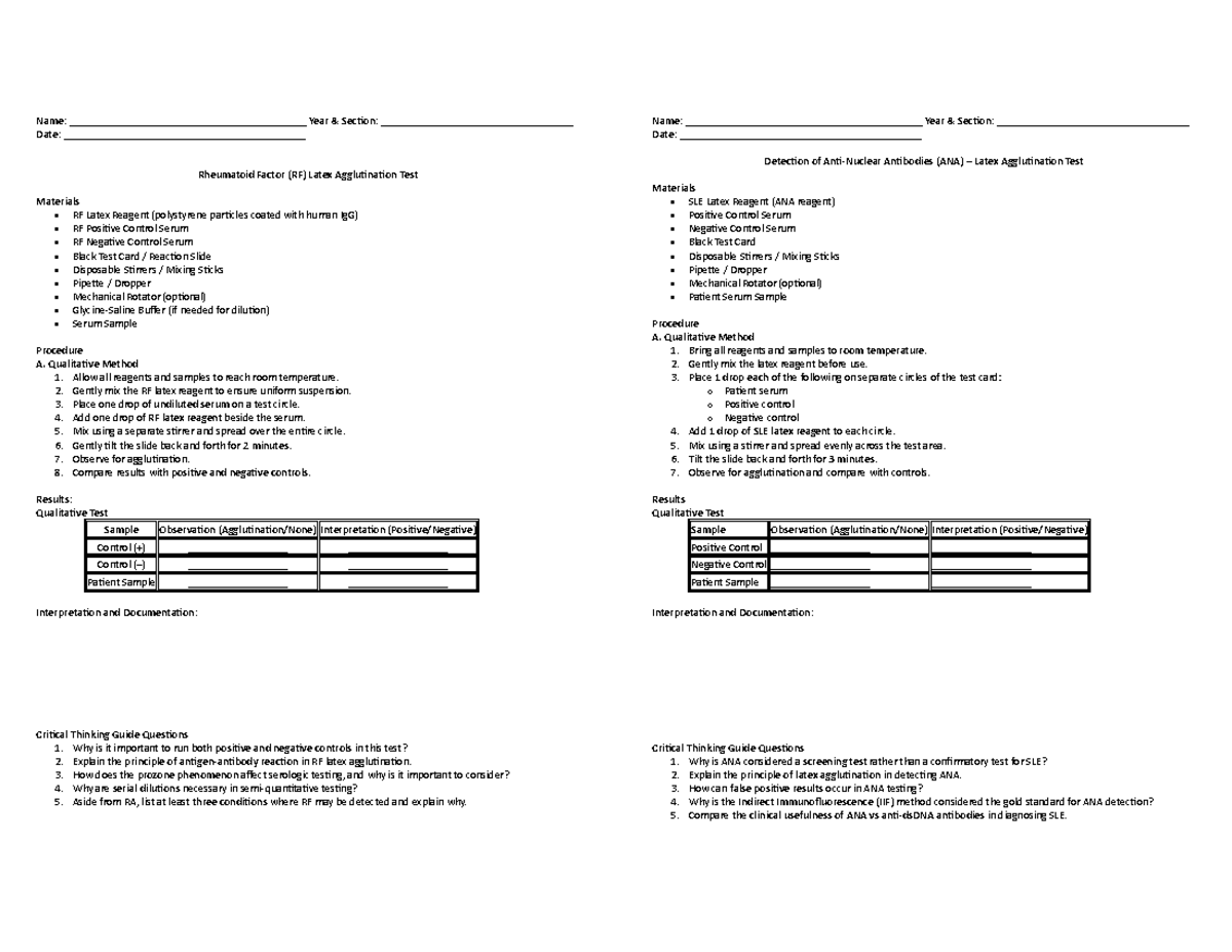 RA and SLE Testing Procedures: Latex Agglutination Methods - Studocu