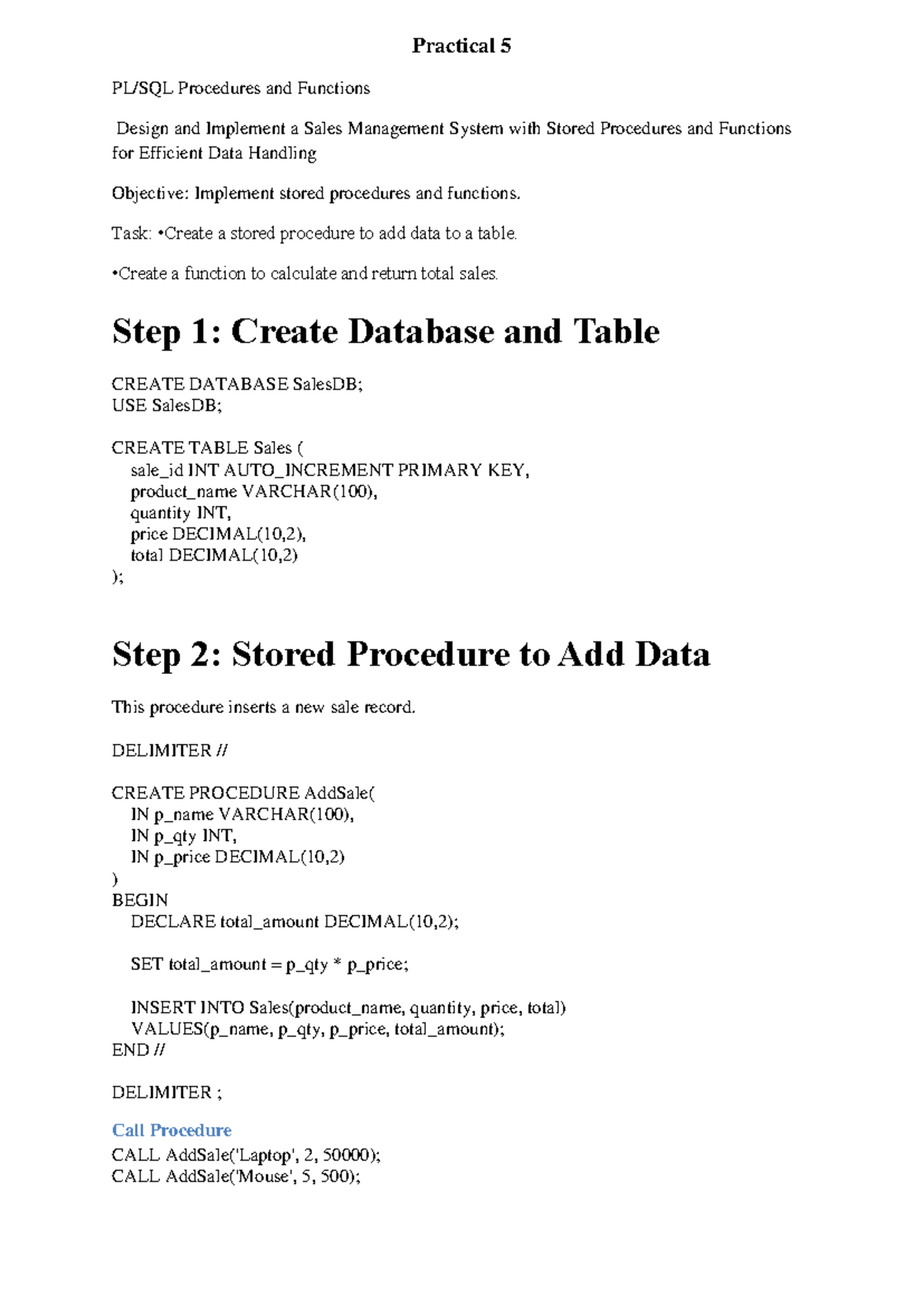 DBMS Practical 5: Designing a Sales Management System with Procedures ...
