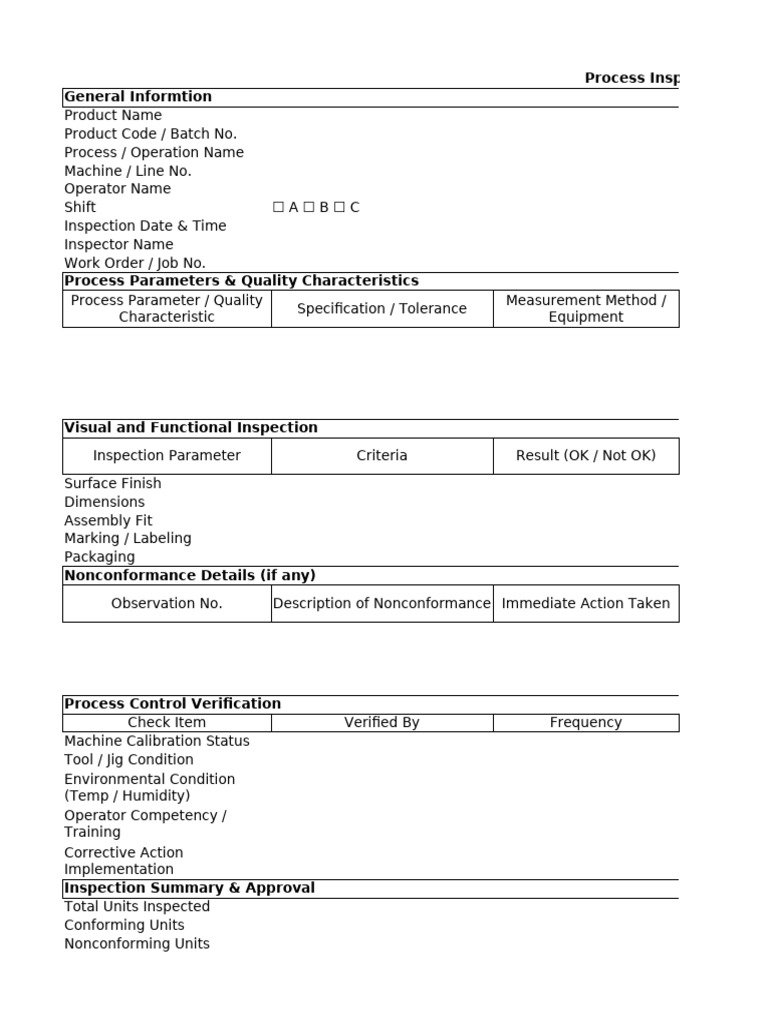 In-Process Inspection Form format| Excel | PDF | Sample