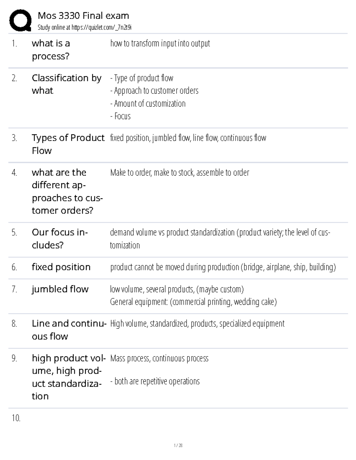 Mos 28 Quiz Practice Cards: Process Flow & Production Strategies - Studocu