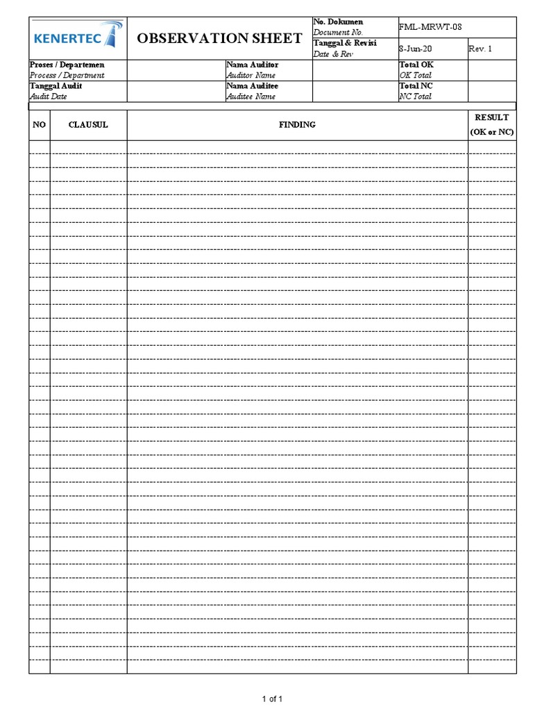 Observation Sheet: Document No. Date & Rev Process / Department Auditor ...
