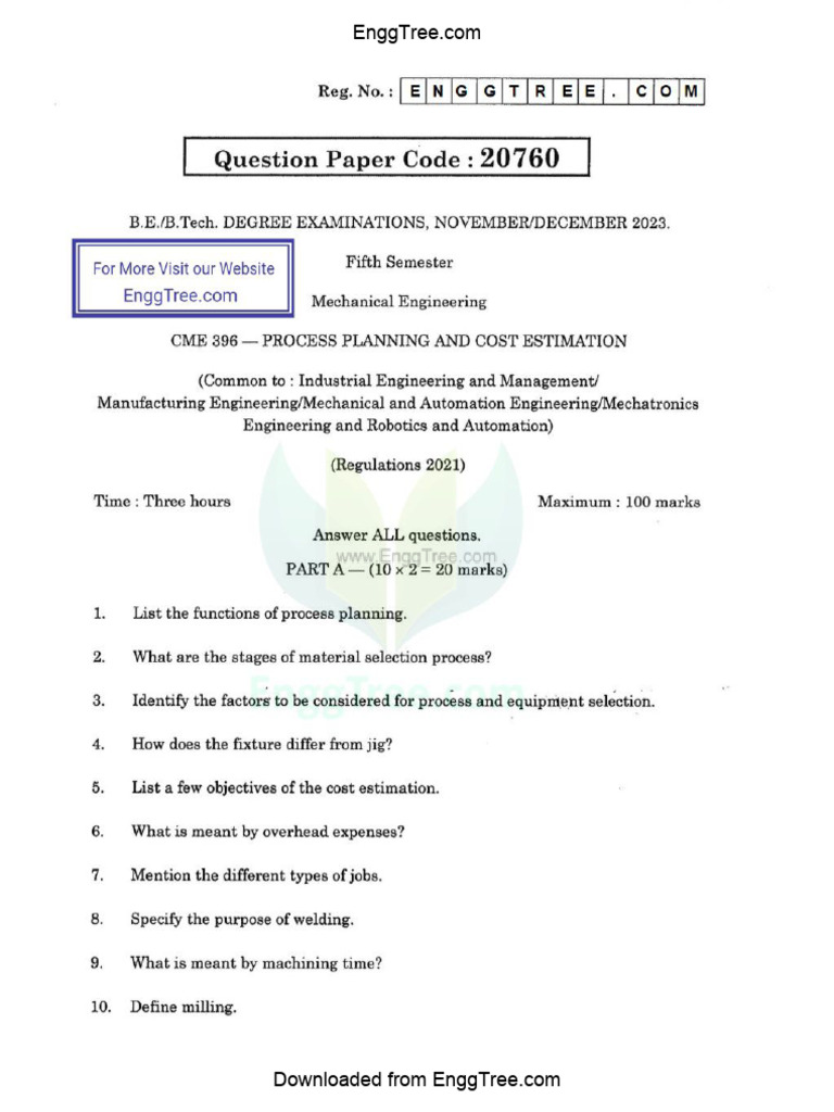 CME396 Process Planning and Cost Estimation Nov Dec 2023 Question Paper ...