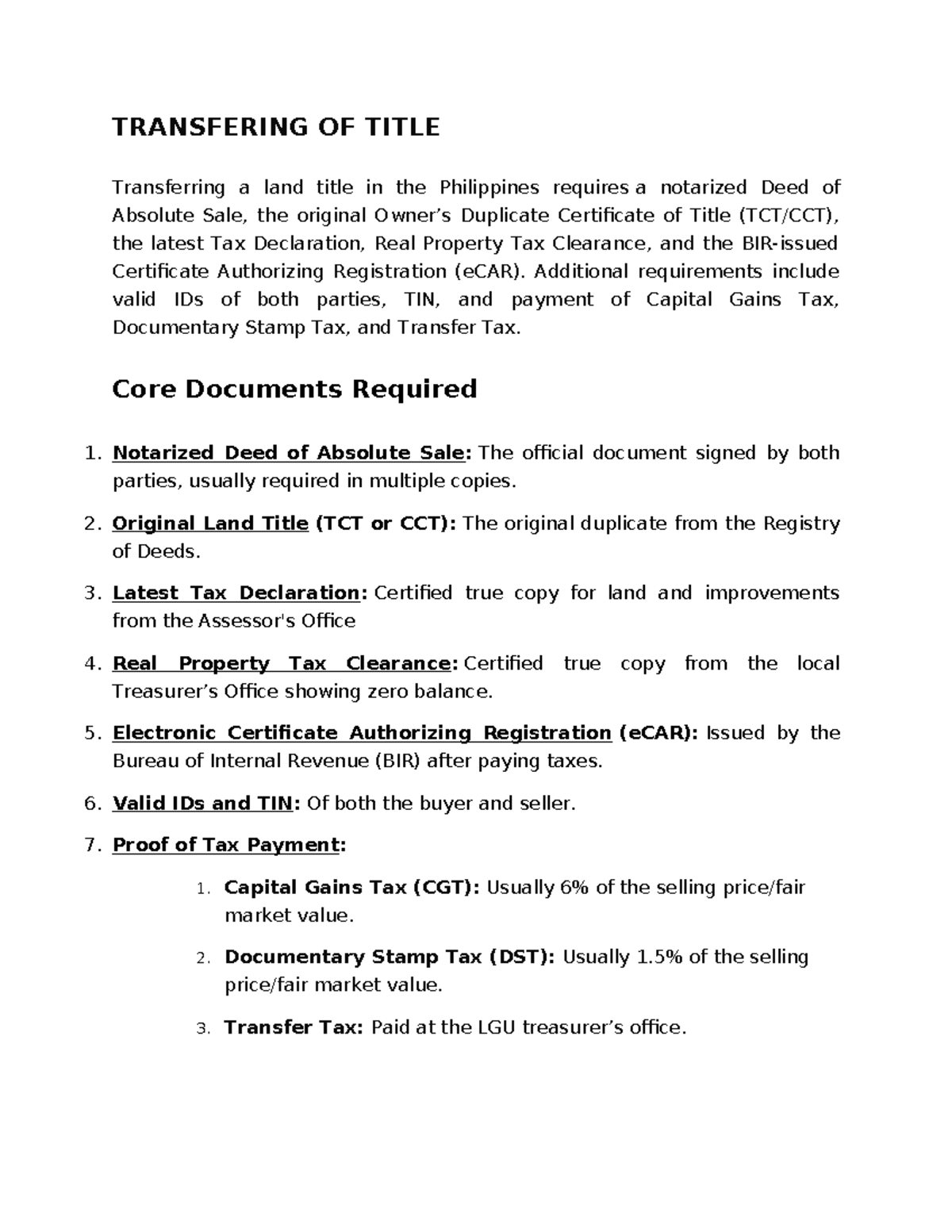 TRANSFER OF LAND TITLE IN THE PHILIPPINES: REQUIREMENTS & PROCESS - Studocu