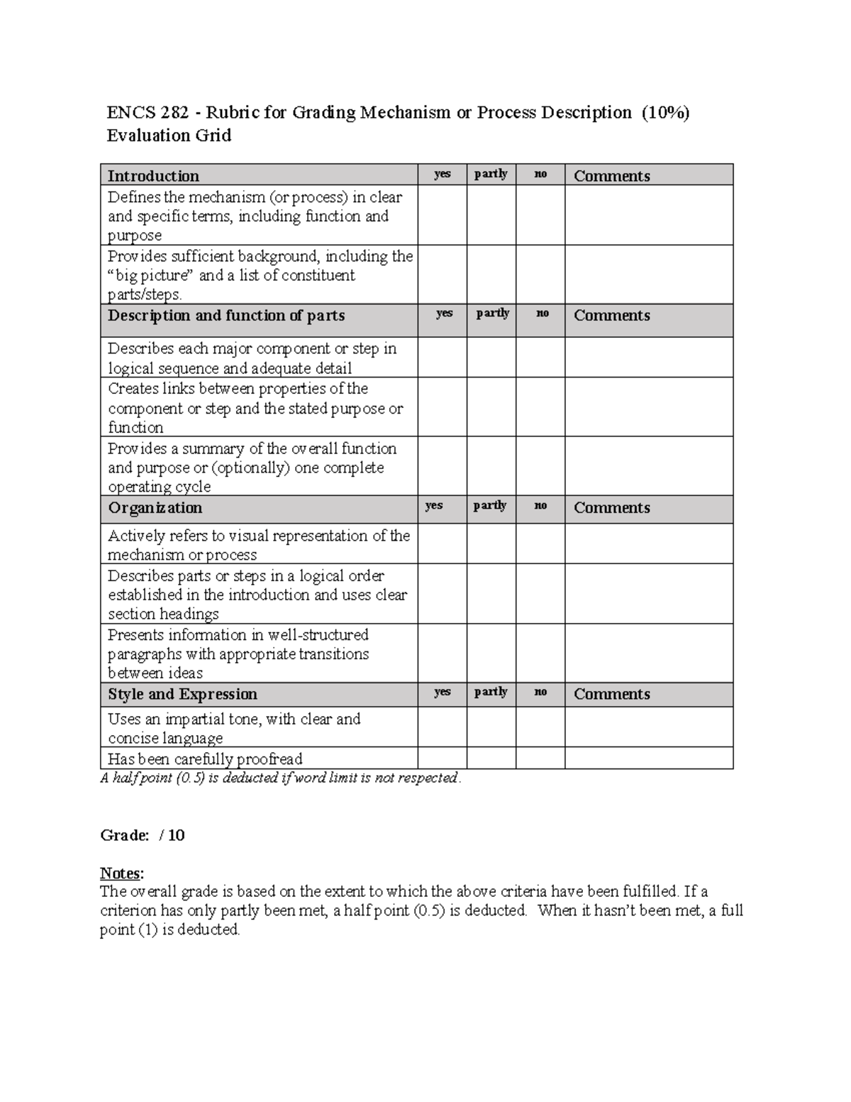 ENCS 282 Assessment Rubric for Mechanism/Process Description - Studocu