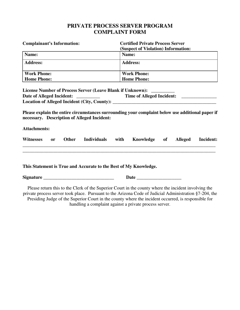 Arizona Private Process Server Program Complaint Form - Fill Out, Sign ...