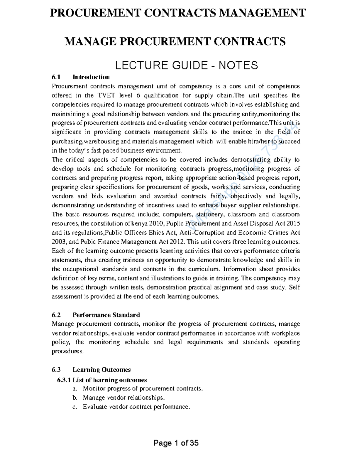Procurement Contracts Management Level 6 Lecture Guide Notes - Studocu
