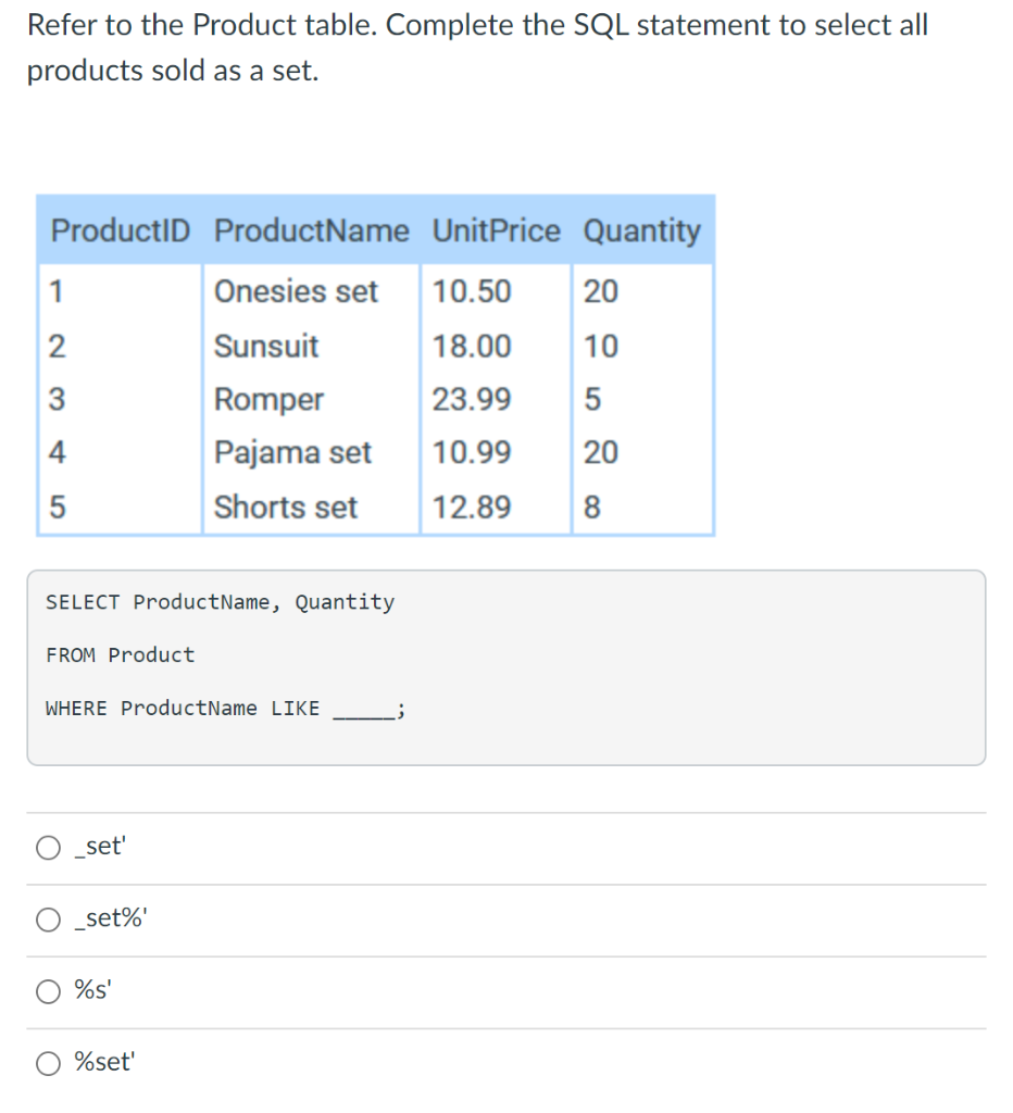 Solved Refer to the Product table. Complete the SQL | Chegg.com
