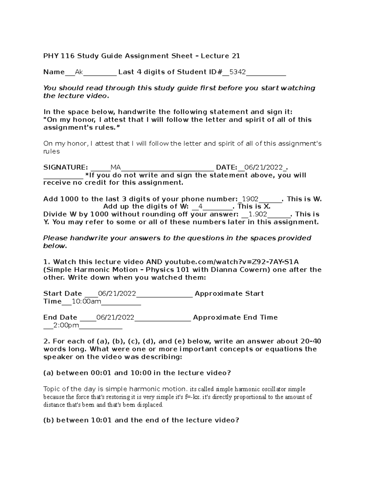 PHY 116 Study Guide 21 - weekly assignments for professor Ahmad - PHY ...