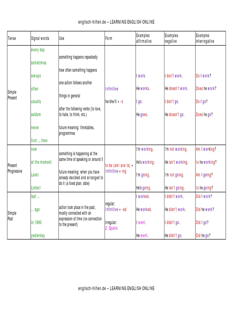 Tense Table Use Form And Time Expressions Present All English Tenses