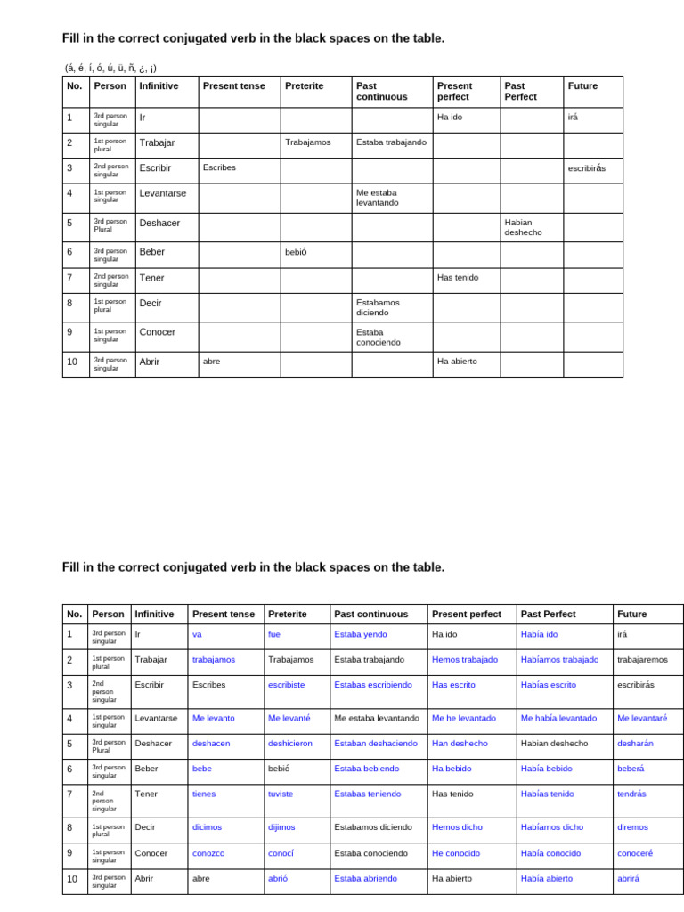 Conjugation Tables Sheet - practice conjugating regular and irregular verbs