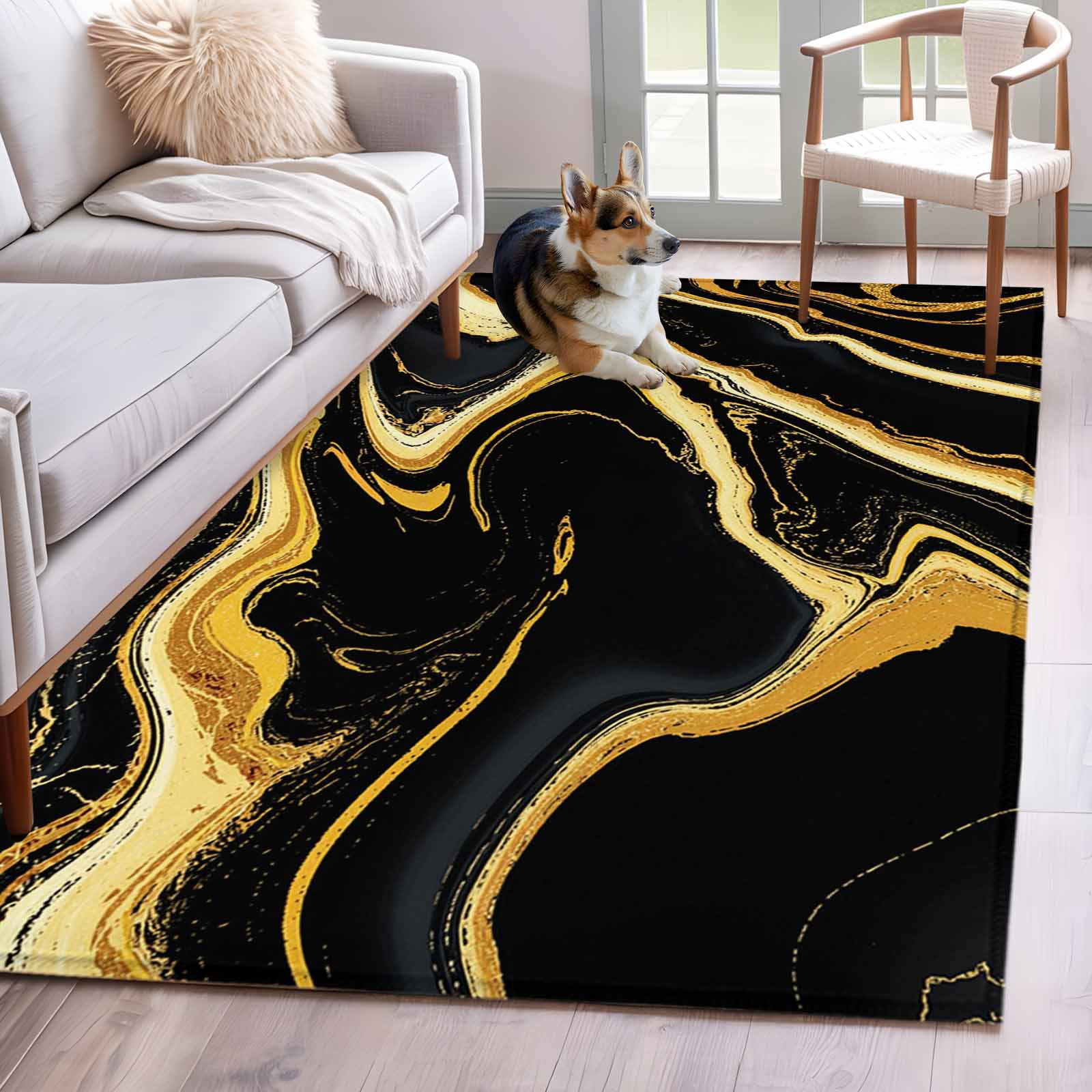 Black Gold Washable Area Rug 3x5 Marble Luxury Abstract Glitter Fluid ...