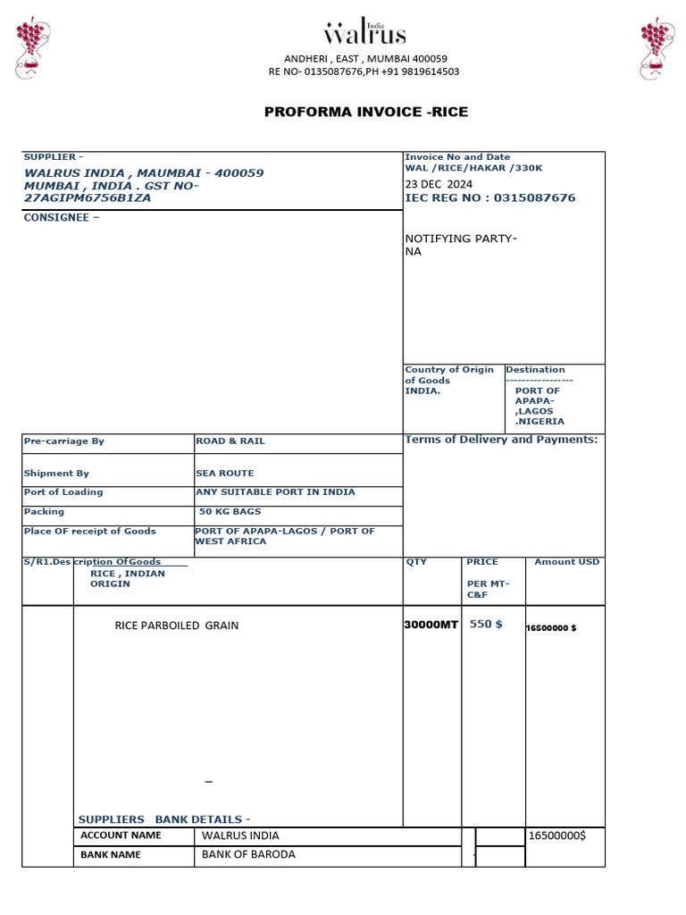 Proforma Invoice for Rice Supply to Nigeria | PDF | United States ...