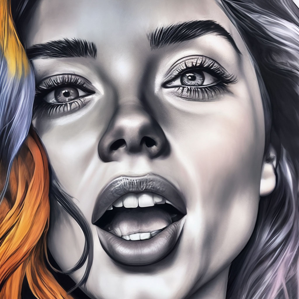 "Colored ink drawing, Anna de armas mouth open, eyes strongly slanted ...