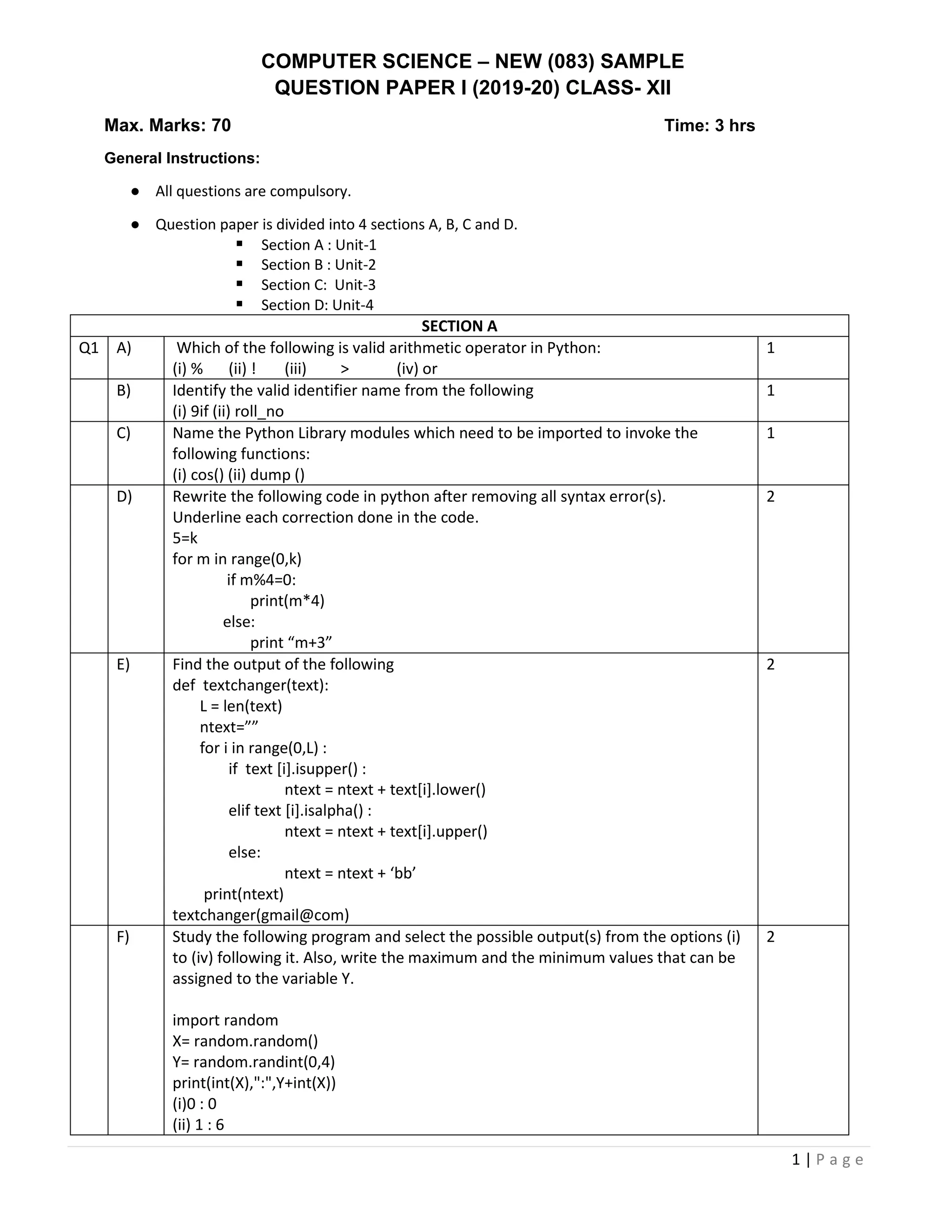 Class 12 computer sample paper with answers | PDF