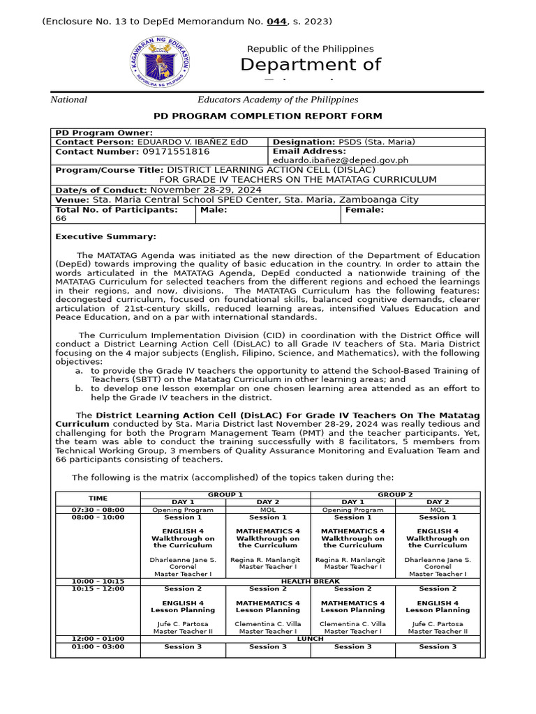 Enclosure No. 13 PD Program Completion Report Form | PDF | Curriculum ...