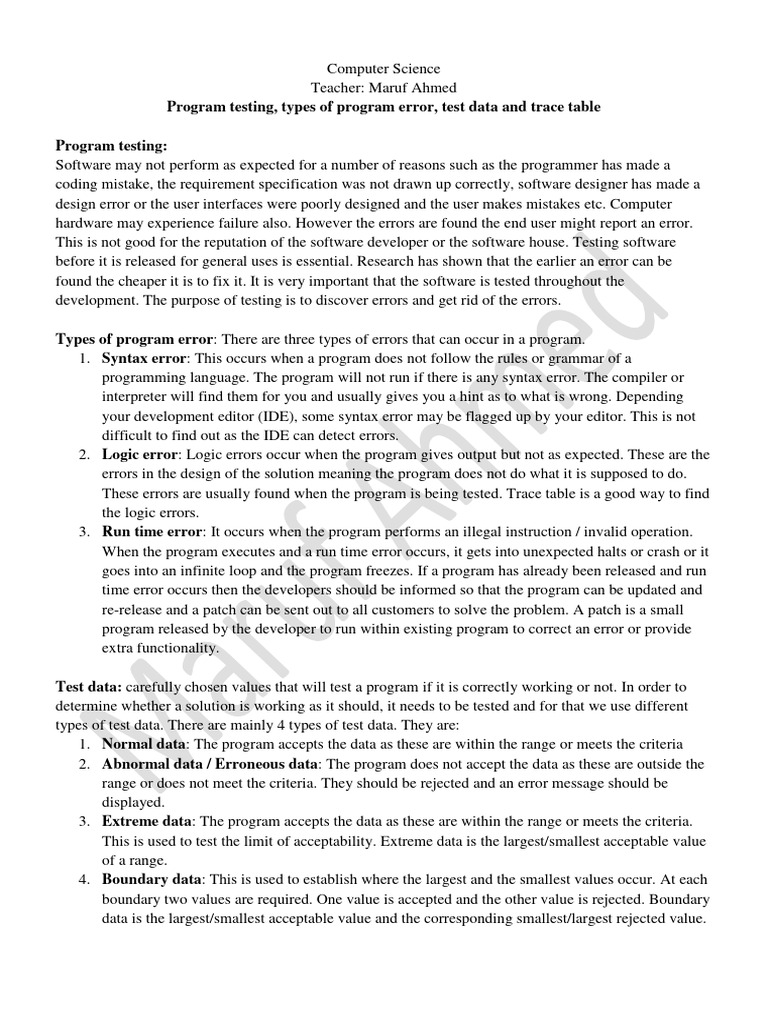Program Testing, Types of Program Error, Test Data and Trace Table | PDF