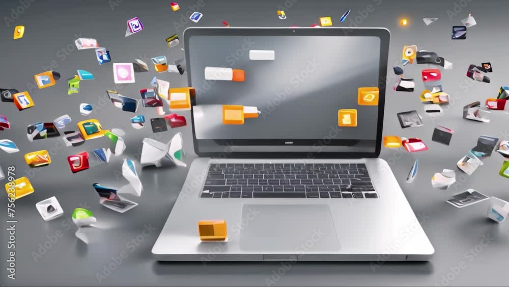 Abstract program icons fly around the laptop and appear on screen on ...