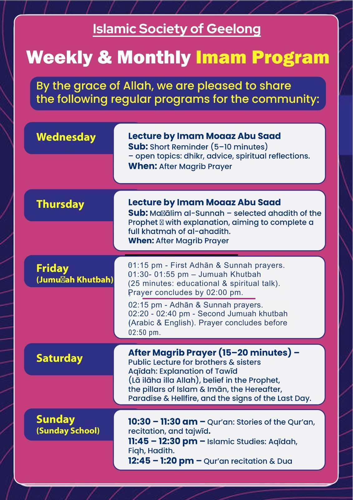 WEEKLY & MONTHLY PROGRAMS - Islamic Society of Geelong