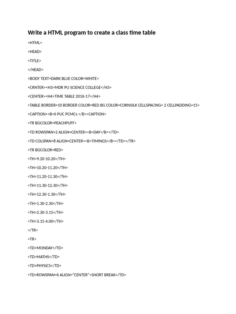 Write A HTML Program To Create A Class Time Table | PDF | Computers