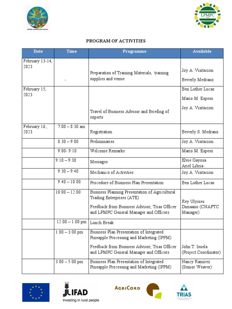 Program of Activities:: Time Activity Materials Instructions End Result ...