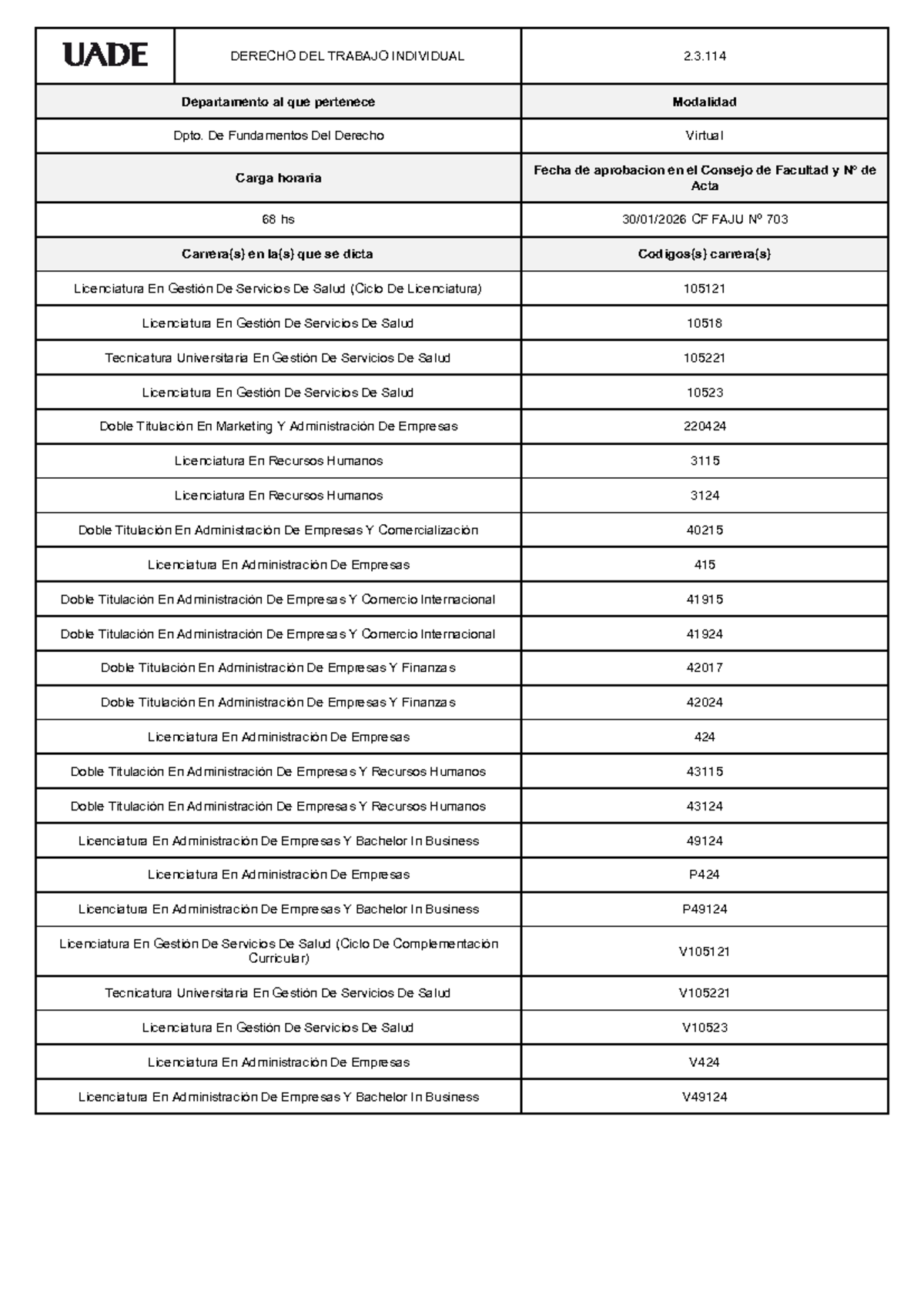 Programa - DERECHO DEL TRABAJO INDIVIDUAL 2.3.114: Contenidos y ...