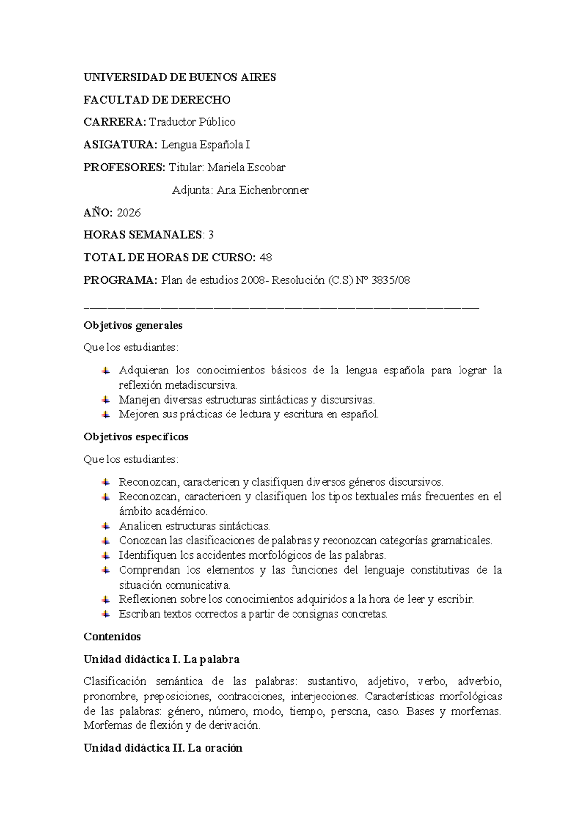 Programa de Lengua Española I (Traductor Público) - 2026 - Studocu