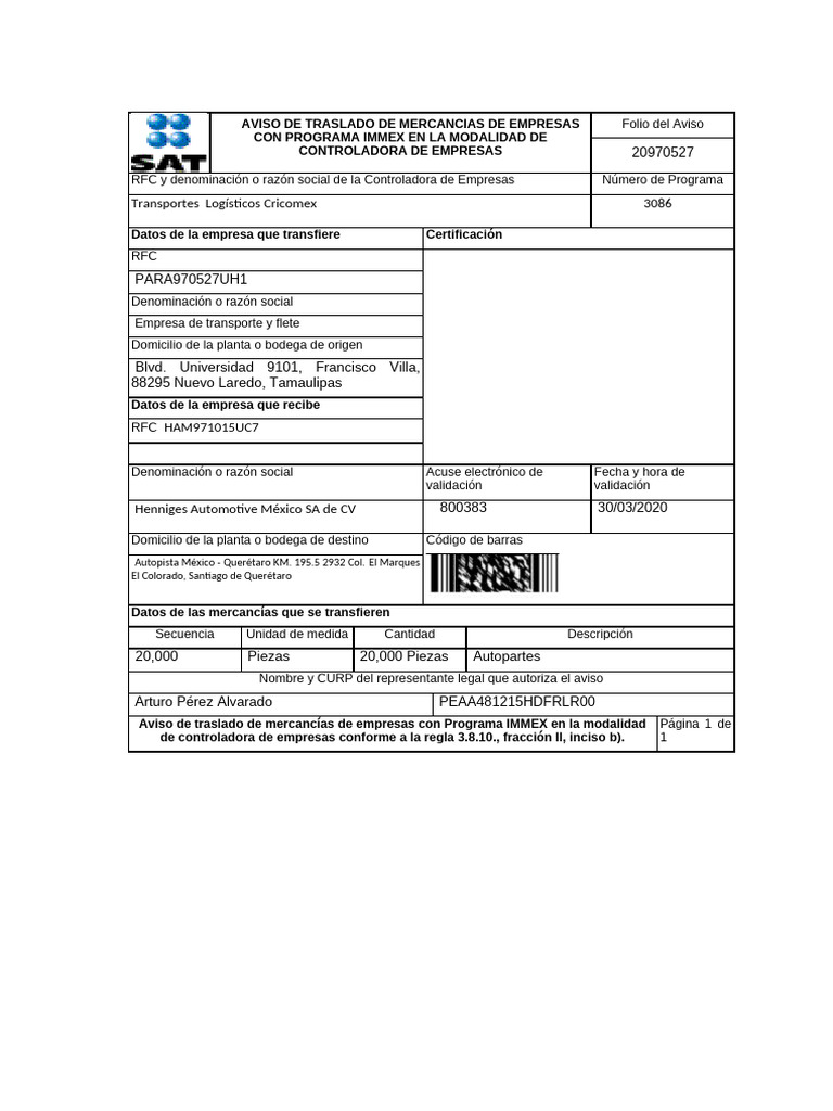 Aviso de Traslado de Mercancias de Empresas Con Programa Immex | PDF