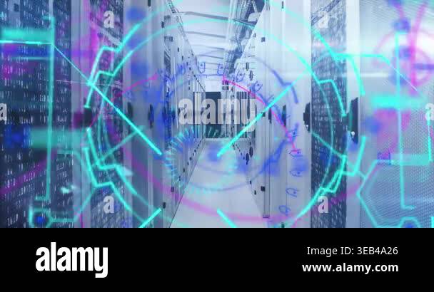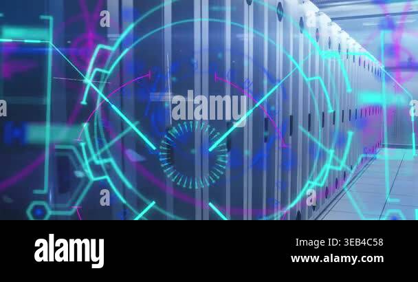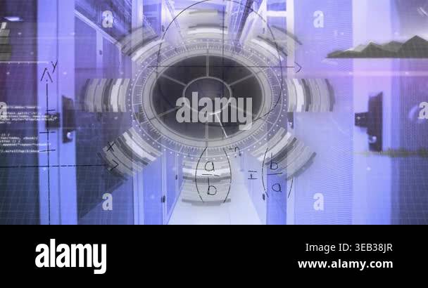 Animation of neon processing circle and math formulas over servers ...