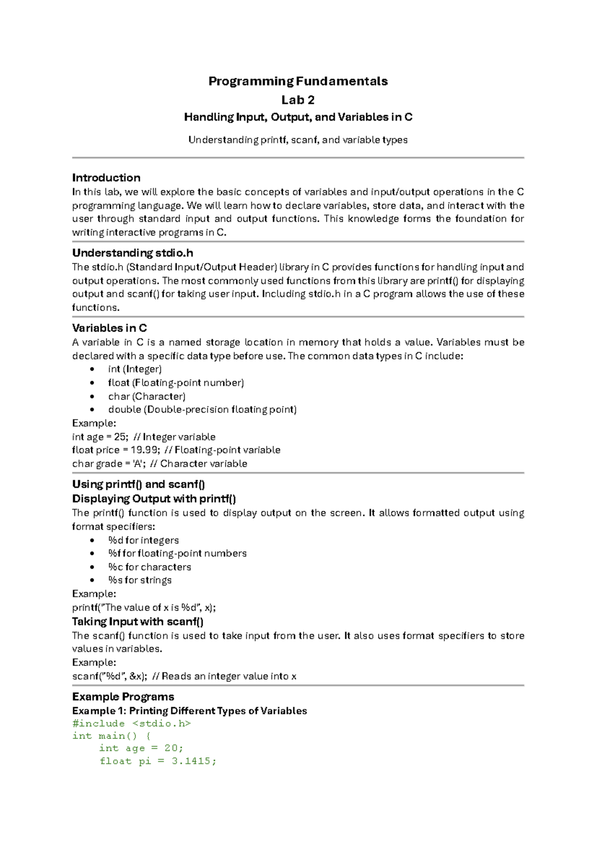 C Programming Fundamentals Lab 2: Input, Output & Variables - Studocu
