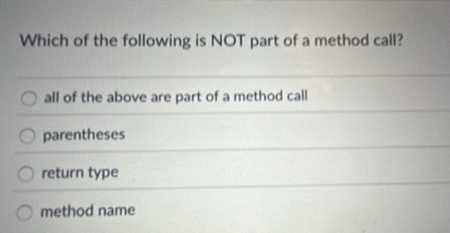 Solved: Which of the following is NOT part of a method call? all of the ...