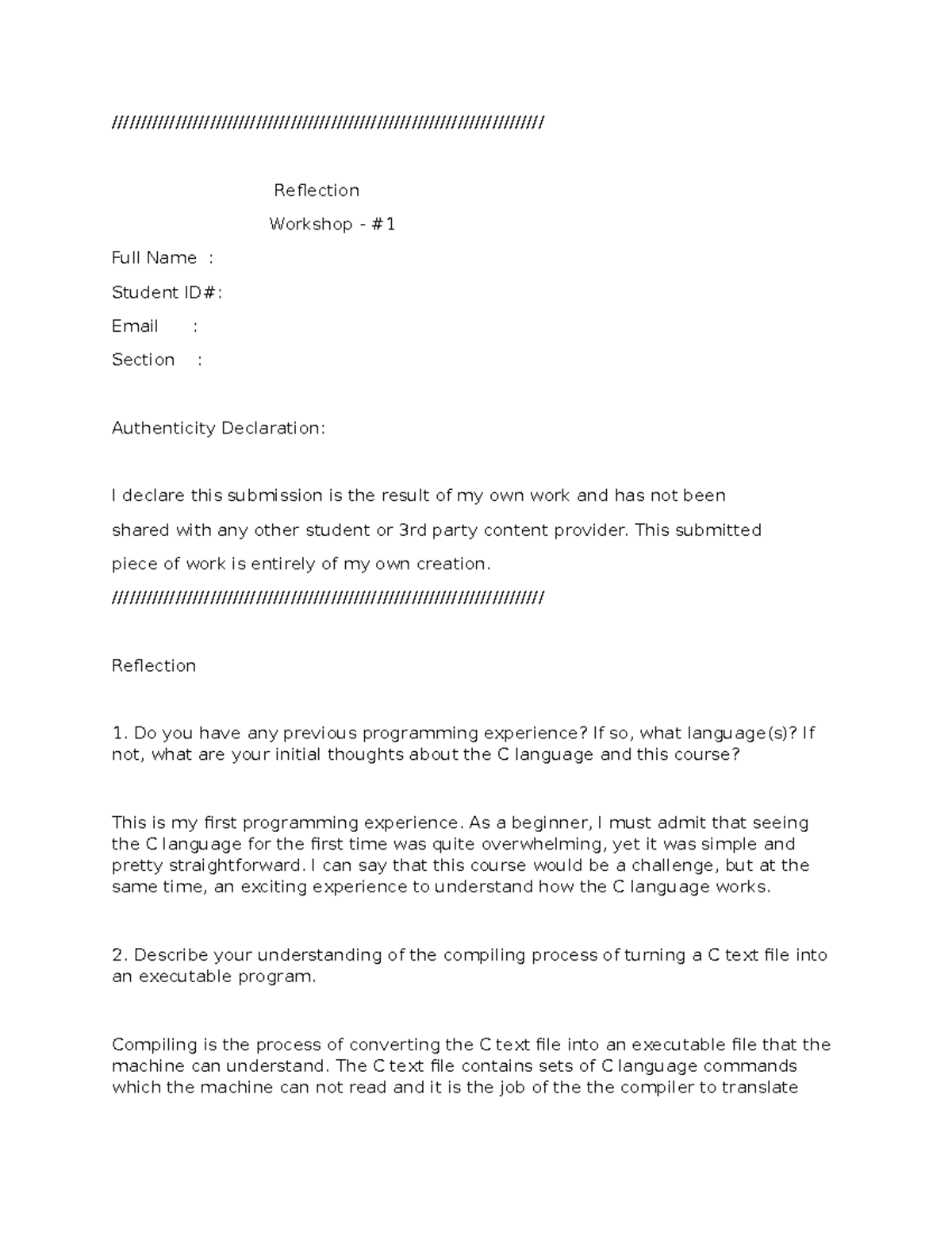 Reflection 1 - Workshop on C Programming Fundamentals W1p1 - Studocu