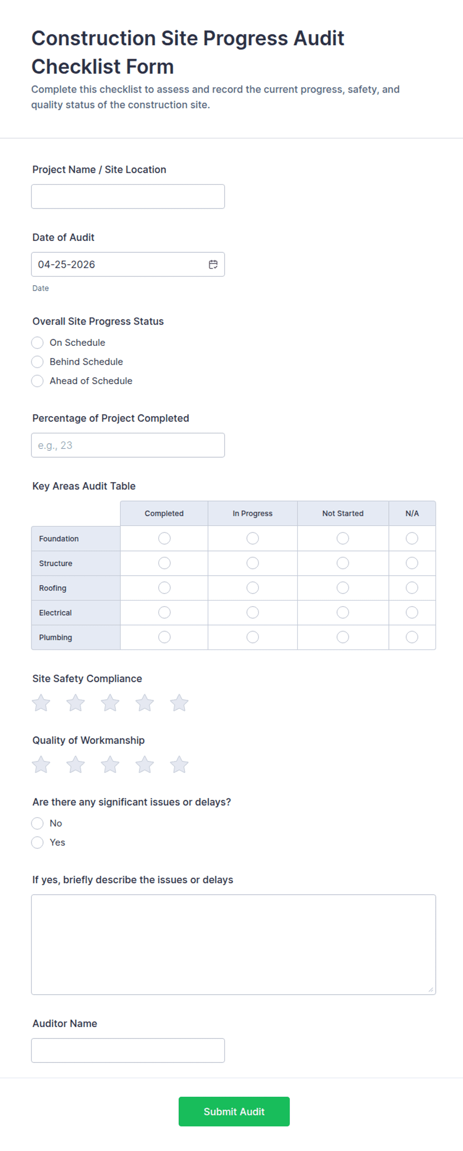 Construction Site Progress Audit Checklist Form Template | Jotform